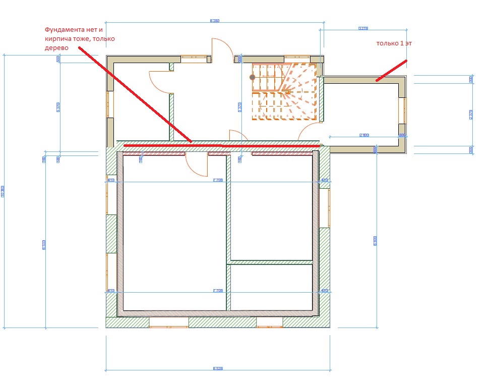 Внизу сам дом, кирпичная кладка не показана -только дерево и газоблок. Справа пристройка - которая так и останется без второго этажа (1,5 кирпича), сверху веранда над которой нужно подымать 2-ой этаж (1 кирпич)