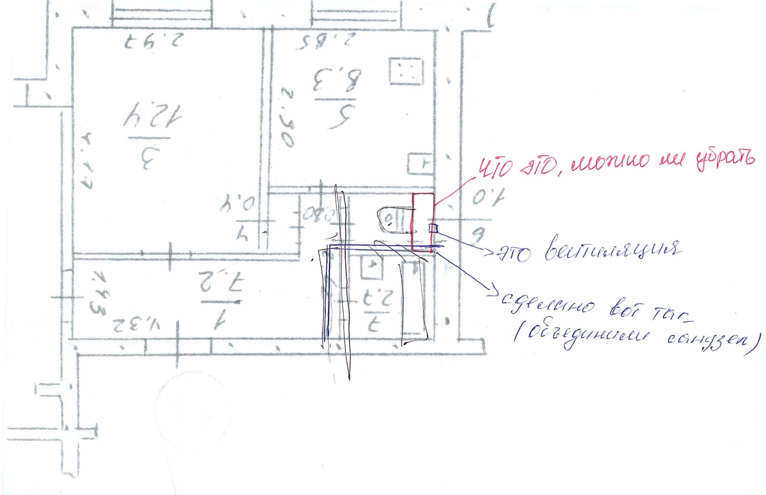 История такова: мы объединили санузел и частично оттяпали часть коридора, туалет уменьшили и за счет этого расширили кухню, убрали кладовку напротив туалета. Хотим узаконить перепланировку, но вот встал вопрос :что это за "помещение" (обведено красным цветом) на плане в тех паспорте? Синим цветом указанно как сделали. Родная вент шахта - тоже обозначена синим цветом, она сейчас получилась на кухне.