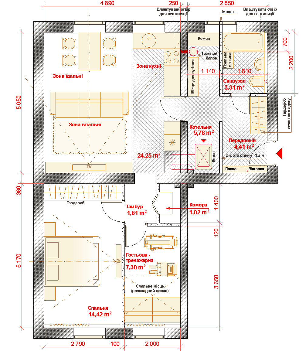 Вікна в квартирі, скоріш за все, на 2 створки. Між створками – імпост. До цього імпосту підводимо перегородку, що розділяє приміщення санвузлу і котельні-холу. Зону, де встановлено котелі, візуально відділяємо від холу невисокою перегородкою (висота - 1,20 м). Отримуємо умовно відокремлену котельню, яку не видно, але в достатньому об’ємі повітря, з вікном і вентиляцією.