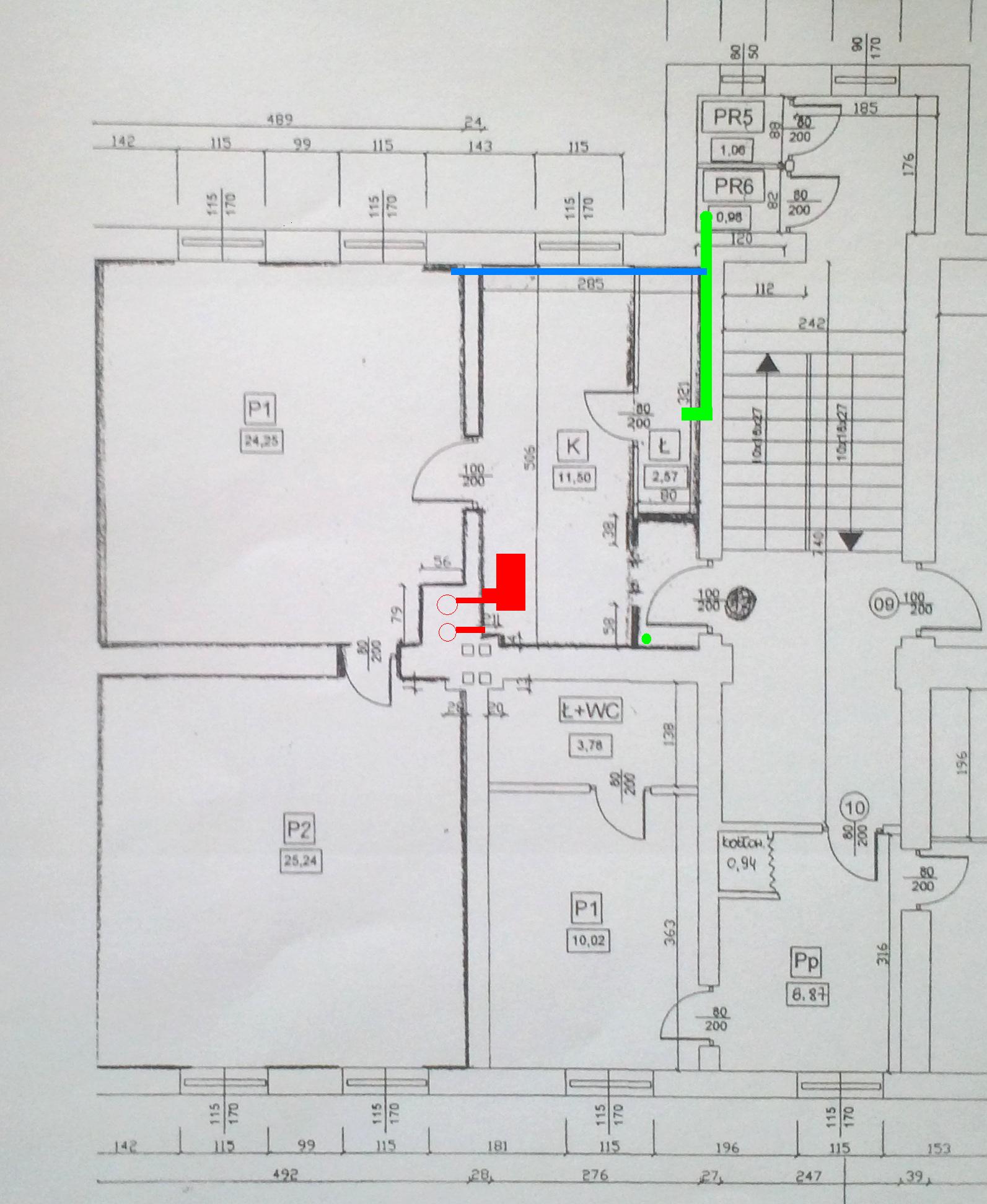 Каналізацію показано зеленим. Сам стояк в PR6. Блакитним кольором - планована труба до майбутнього умивальника.