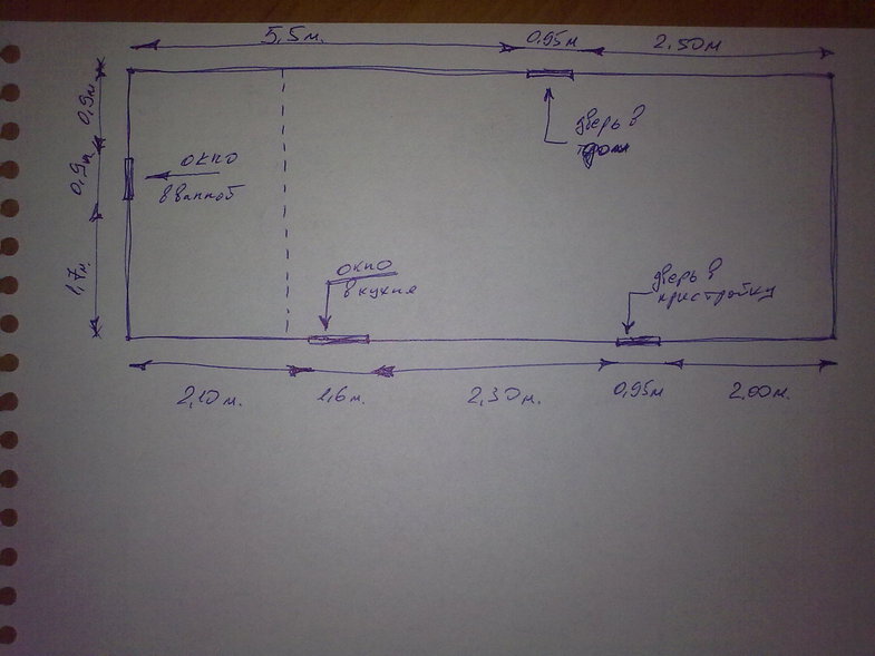 - перегородку между кухней и санузлом можно возводить на любом расстоянии от фундамента (на чертеже показан эконом-вариант, при котором окно не нужно двигать). Основанием для перегородки может быть бетонная подушка по утрамбованному грунту.