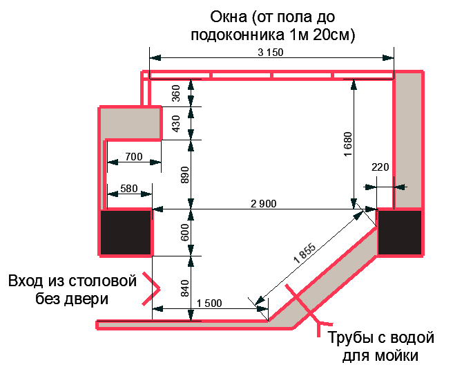 Купили квартиру с перепланировкой. У нас присоединена лоджия и есть возможность устроить в ней кухню. Но проблема в том, что помещение получилось нестандартной формы. Как правильно расположить мебель?