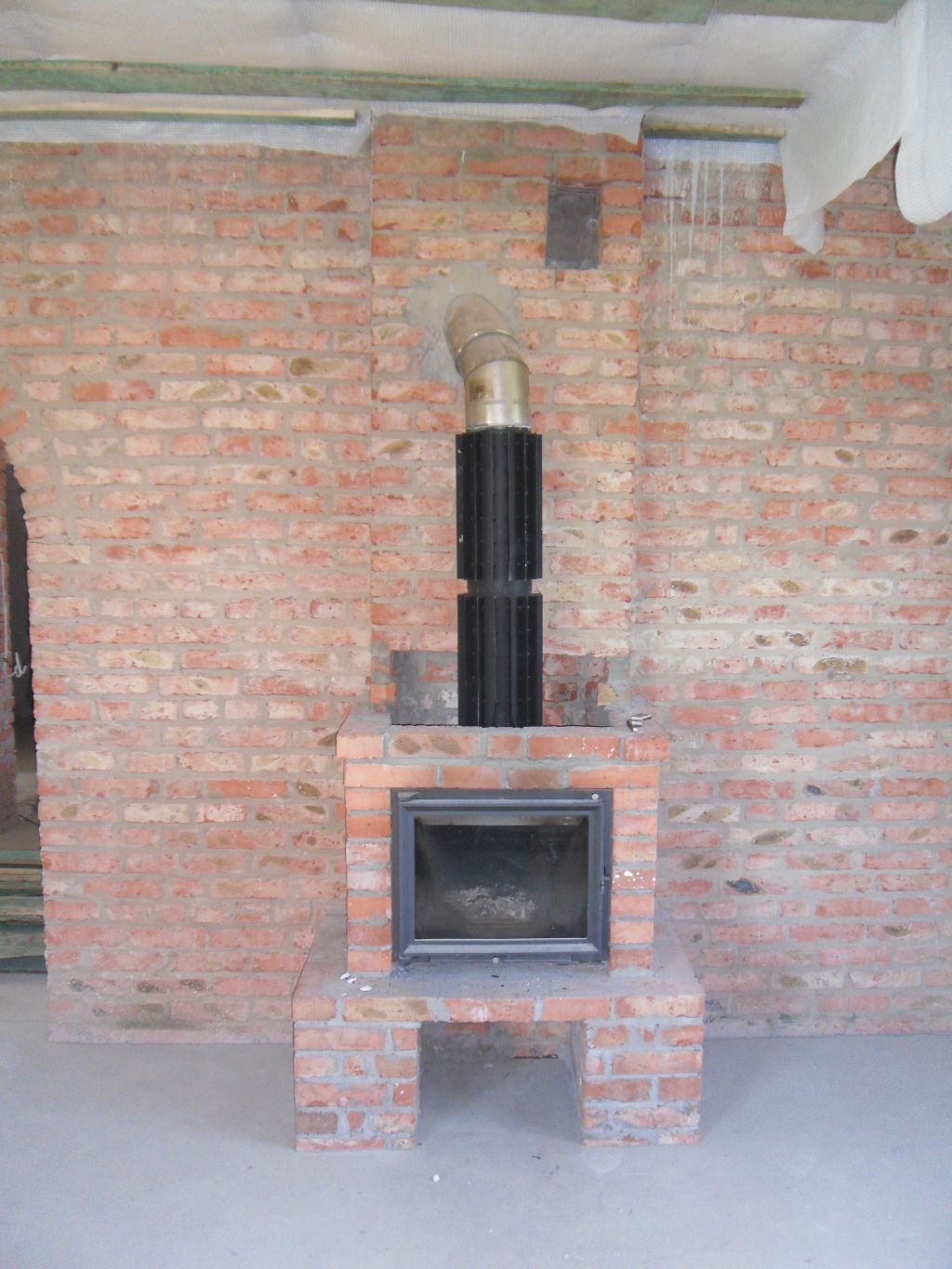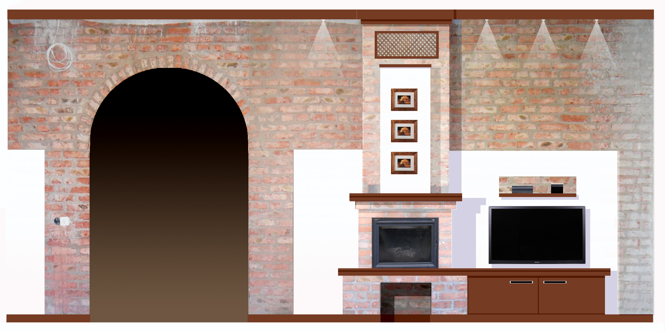 Використовуємо темне дерево - полиця каміну, тумба під ТВ - як один композиційний елемент. Трубу димаря обшиваемо гіпсокартоном, декоруємо.