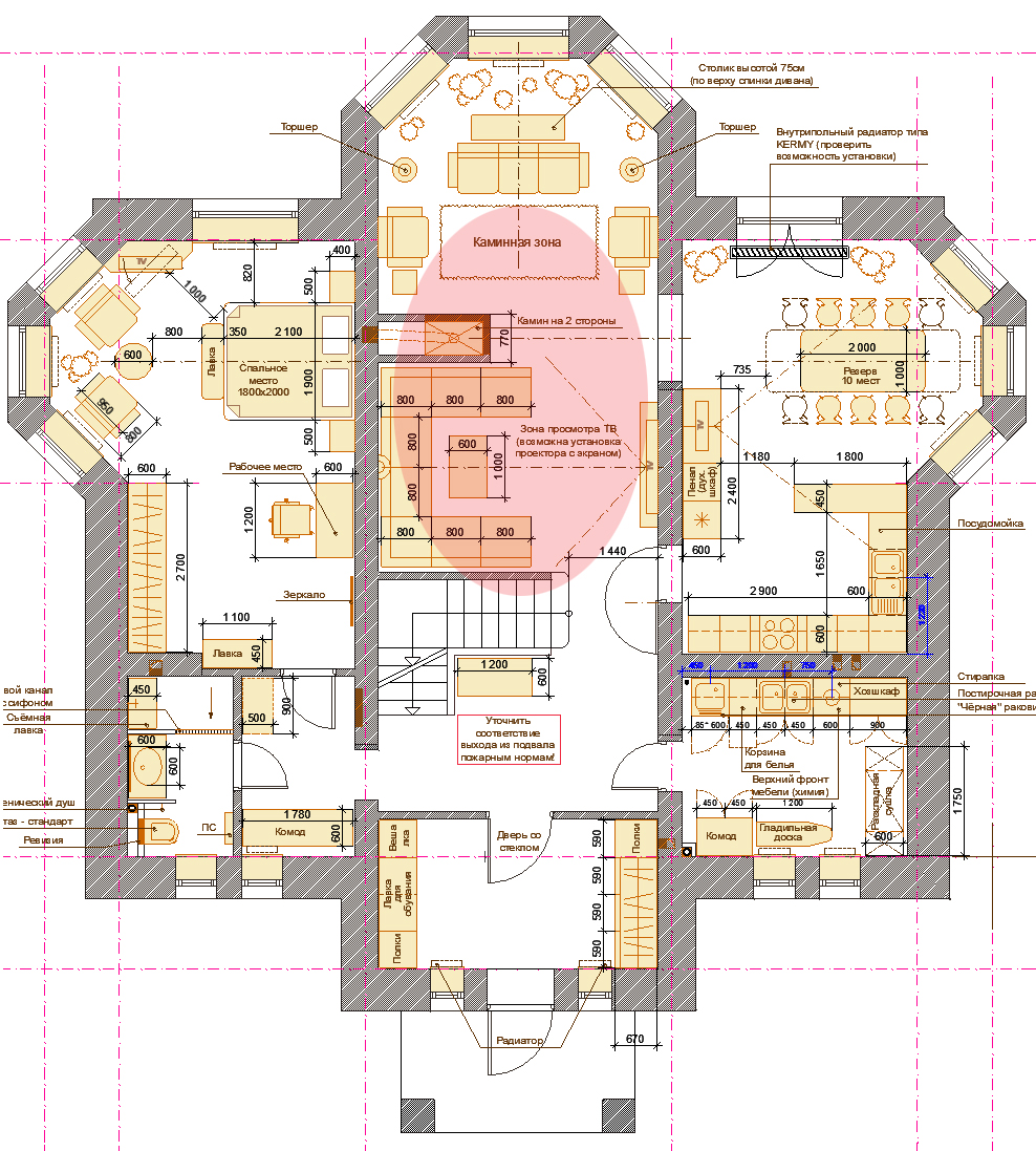 С Вашим решением по размещению мебели согласен, но сомневаюсь, что гостиная, разделённая камином, будет выглядеть хорошо. Прокомментируйте такое решение.