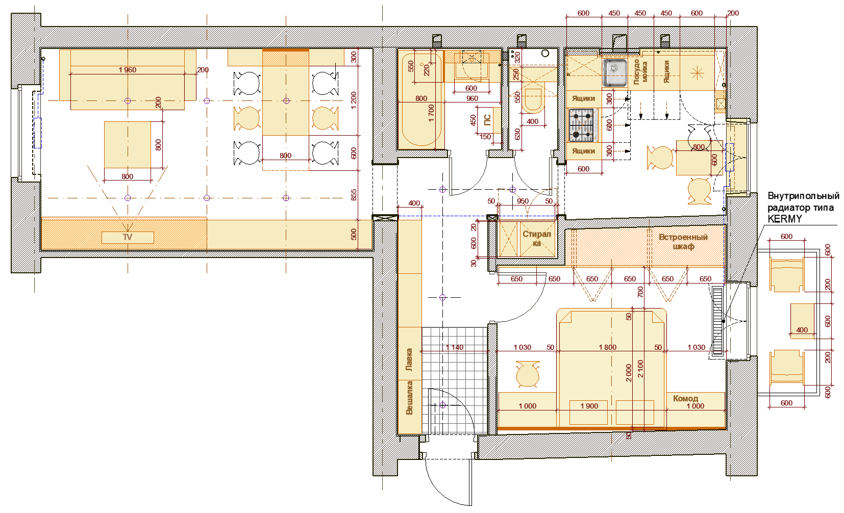 1. Перегородку між кухнею і кімнатою, яка криво стоїть, зносити не буду, тому треба малювати її, як вона є.