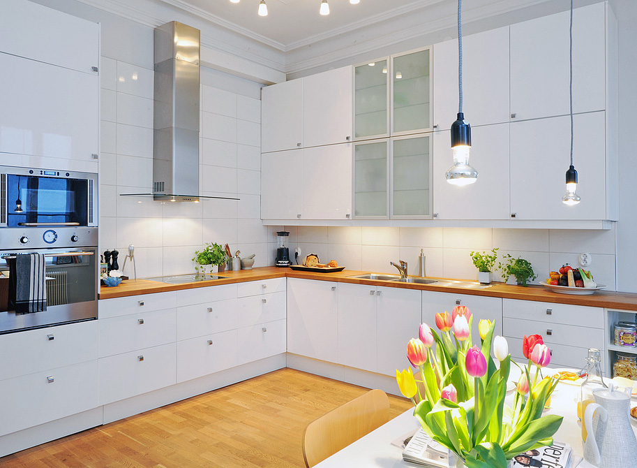 - на стене, там, где раковина, верхние шкафчики не нужны, возможна открытая полка;
